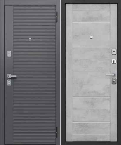 Внутренняя отделка: Царговая МДФ панель 22 мм. Покрытие ПВХ Бетон снежный. Вставки из сатинированного стекла Лакобель.